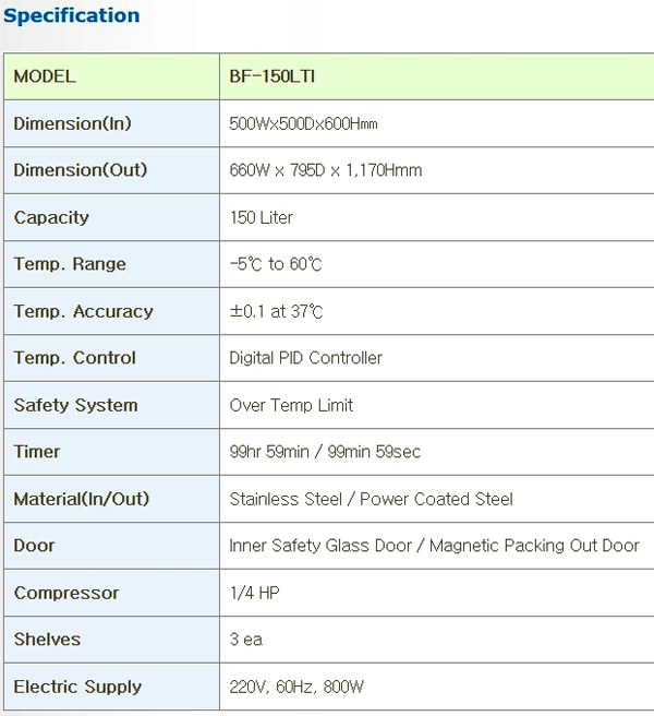. Á¦Ç°¸í : Low Temperature Incubator (Àú¿Â ÀÎÅ¥º£ÀÌÅÍ) . Á¦Á¶»ç : BioFree (Çѱ¹) . ¸ðµ¨¸í : BF-150LTI . Àü¿ø : ´Ü»ó 220V, 60Hz . ¼ÒºñÀü·Â : 1kW . ³»ºÎ¿ë·® : ¾à 150L . ¿Âµµ¹üÀ§ : 0¡É ~ 60¡É . Á¦¾î¹æ½Ä : µðÁöÅÐ PID ¿Âµµ Á¶Àý . ³Ã°¢¹æ½Ä : °Á¦ ¼øÈ¯½Ä °ø³Ã ½Ã½ºÅÛ . ÀçÁú : ³»ºÎ ½ºÅ×Àθ®½º(SUS304), ¿ÜºÎ ºÐüµµÀå °ÆÇ . ±â´É : ³Ã¡¤°¡¿ ÀÚµ¿Àüȯ, ¿Âµµ ¾Ë¶÷, µðÁöÅРǥ½Ãâ, ³»ºÎ ÆÒ ¼øÈ¯ . Ư¡ : Àå½Ã°£ ¾ÈÁ¤ÀûÀÎ Àú¿Â À¯Áö, ¼ÒÀ½¡¤Áøµ¿ ÃÖ¼ÒÈ ¼³°è, ¿Âµµ ±ÕÀϼº ¿ì¼ö