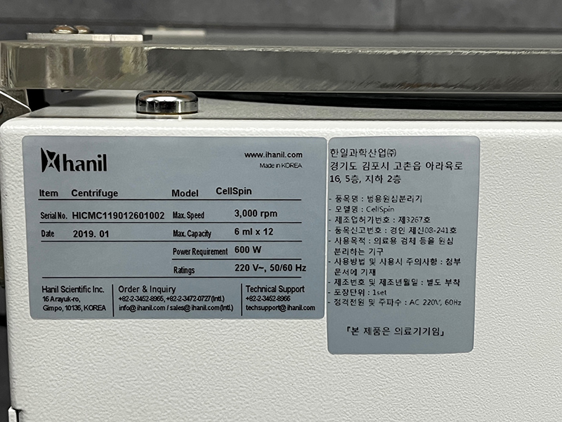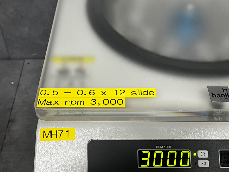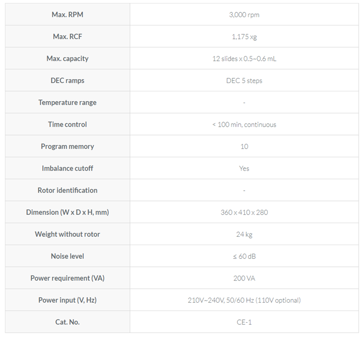 . Á¦Á¶»ç : ÇÑÀÏ  . Max. RPM : 3,000 rpm  . Max. RCF :  1,175 xg  . Max. Capacity : 12 slides x 0.5~0.6 mL  . Dimension(W x D x H): 360 x 410 x 280 mm  . Weight: 24 kg