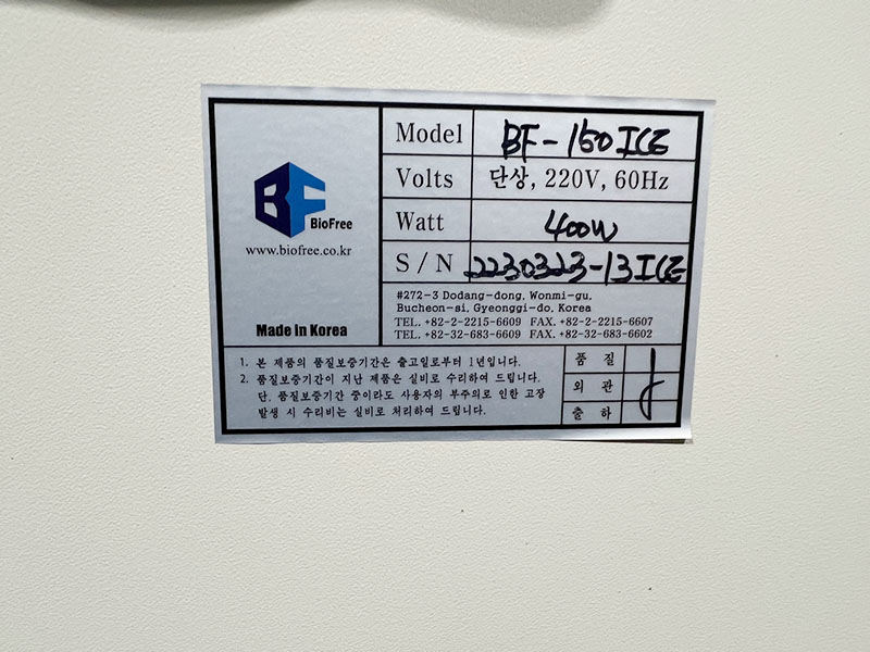 . Á¦Á¶»ç : Biofree  . Model : BF-150ICE  . ¾óÀ½ Á¾·ù : Ç÷¹ÀÌÅ© À¯Çü  . W1050 X D700 X H1150 mm  . ¿ë·® : 300kg/1ÀÏ  . º¸È£À屸 : Àü¿øÂ÷´Ü±â, ¼öÀ§¸ð´ÏÅÍ  . ½ºÅ×Àη¹½º ½ºÆ¿  . Àü±â°ø±Þ : 220V, 60Hz, 1.2Kw