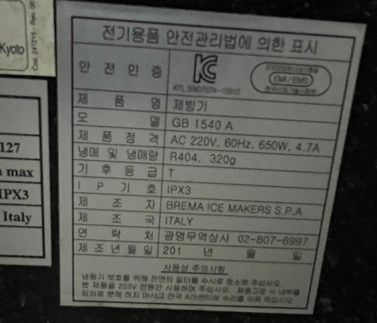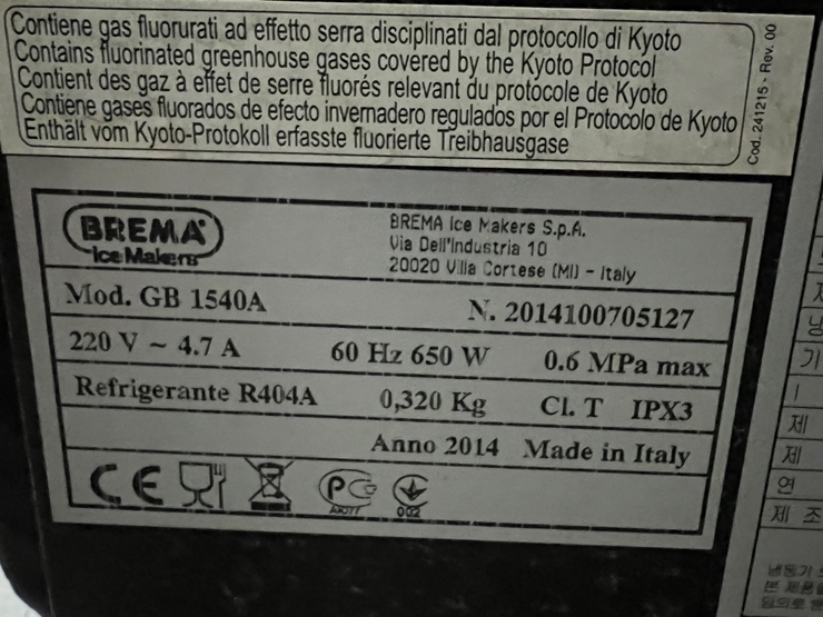 . Maker : Brema  . Model : GB1540A  . FLAKE type (¾Ë°»ÀÌ ÀÔÀÚÇü ¾óÀ½, Snow ³ª °¢Áø ¾óÀ½ÀÌ ¾Æ´Ô)  . Å©±â : W740 X D700 X H1070 mm  . Power : AC220v  . ¼³Ä¡ºñ º°µµ(\110,000), ¿î¼Ûºñ º°µµ  . ³Ãµ¿±â ÀåÂø Á¦Ç°Àº ÅÃ¹è ºÒ°¡´ÉÇÕ´Ï´Ù.