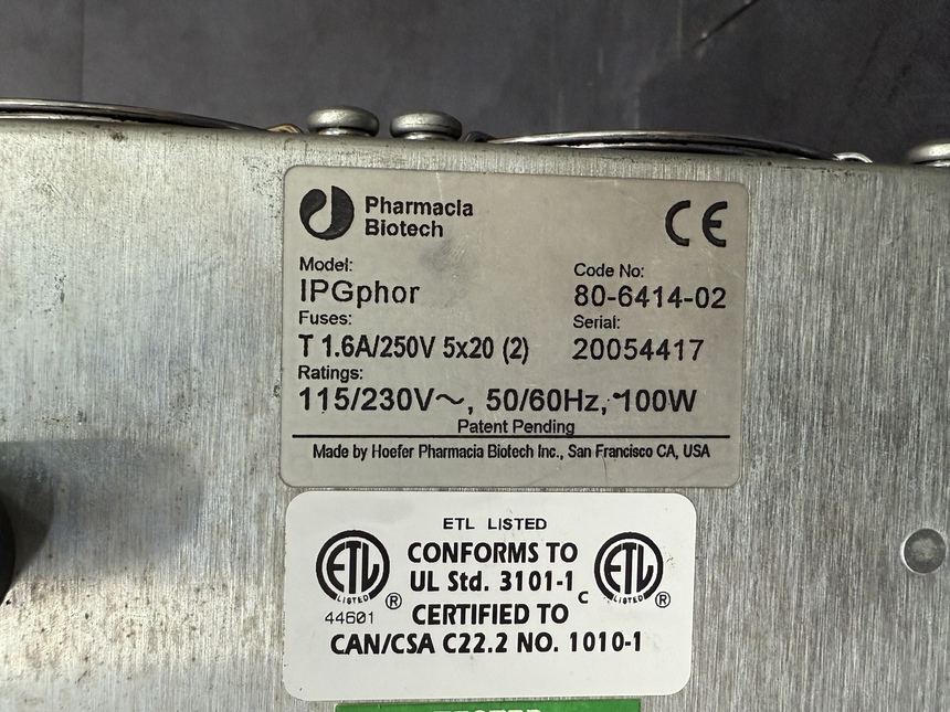 | Ç× ¸ñ | »ó ¼¼ ³» ¿ë |  | Á¦Á¶»ç / ¸ðµ¨¸í | Pharmacia Biotech / IPGphor |  | Code No. | 80-6414-02 |  | Á¦Ç° Á¾·ù | ´Ü¹éÁú Àü±â¿µµ¿ Àåºñ – Isoelectric Focusing (IEF) ½Ã½ºÅÛ |  | Àü¿ø »ç¾ç | 115/230V, 50/60 Hz, 100 W |  | Ç»Áî | T 1.6A / 250V ¡¿ 2 (5¡¿20 mm) |  | Ç÷§Æû ¿Âµµ | 18–25 ¡ÆC |  | IPG ½ºÆ®¸³ ȣȯ ±æÀÌ | 7 cm, 11 cm, 13 cm, 18 cm, 24 cm |  | ó¸® °¡´É ¼ö·® | ´Ù¼öÀÇ IPG ½ºÆ®¸³ µ¿½Ã ó¸® °¡´É (Ȧ´õ ±³Ã¼ ¹æ½Ä) |  | Àü¾Ð ¹üÀ§ | ÃÖ´ë 8,000–10,000 V (´Ü°èº° ÇÁ·Î±×·¡¹Ö °¡´É) |  | ÇÁ·ÎÅäÄÝ ÀúÀå ¿ë·® | ¿©·¯ ½ÇÇè Á¶°Ç ÀúÀå ¹× ´Ü°èº°(stepwise) ½ÇÇà °¡´É |  | µð½ºÇ÷¹ÀÌ | LCD µðÁöÅÐ µð½ºÇ÷¹ÀÌ (Á¶°Ç ¼³Á¤ ¹× ÁøÇà »óȲ Ç¥½Ã) |  | ÁÖ¿ä Æ¯Â¡ | ´Ü¹éÁúÀ» µîÀüÁ¡(pI)¿¡ µû¶ó °íÇØ»óµµ·Î ºÐ¸® |  | 2Â÷¿ø Àü±â¿µµ¿(IEF ¡æ SDS-PAGE) Àü󸮿¡ ÃÖÀûÈ |  | ´Ù¾çÇÑ ±æÀÌÀÇ IPG ½ºÆ®¸³ Áö¿ø |  | ¾ÈÁ¤Àû ¿Âµµ À¯Áö ¹× ÀçÇö¼º ³ôÀº °á°ú Á¦°ø |  | ½ÇÇè ÇÁ·ÎÅäÄÝ ÀúÀå ¹× Àç»ç¿ë °¡´É |  | Àû¿ë ºÐ¾ß | ´Ü¹éÁúüÇÐ(Proteomics), »ýÈÇÐ ¿¬±¸, 2Â÷¿ø Àü±â¿µµ¿(2-DE), Áúº´ ¸¶Ä¿ ´Ü¹éÁú ºÐ¼® |