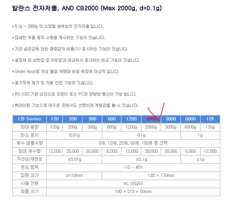 . Á¦Á¶»ç : AND   . Model : CB-2000   . Max. 2000g, d=0.1g, Min 5g  . ¿Âµµ¹üÀ§ : -10 ~ 40 ¡É  . ½Åǰ