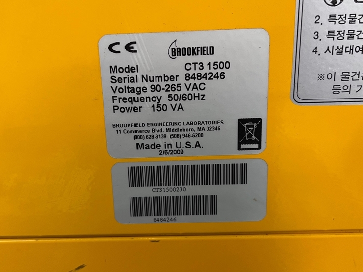 . Maker : Brookfield   . Model : CT3-1500  . ÃøÁ¤ ¹üÀ§ : 0 - 1500g  . ÇØ»óµµ : 0.20g  . ÃøÁ¤Ç׸ñ : °æµµ, ź¼ºÁö¼ö, º¸Á¤ÀÀÁý¼º/¾ÃÈû¼º, ȸº¹Åº¼º, Á¢Âø·Â, °í¹«¼º,                ÀÀÁý¼º, ¾ÃÈû¼º  . ÀÎÅÍÆäÀ̽º : USB  . Áö¿ø OS : Windows(R)2000/XP/VistaTM/7  . Àü¿ø °ø±Þ : 90 - 265V 50/60Hz  . Å©±â : º»Ã¼/266.7 x 266.7 x 609.6mm  . ¹«°Ô : 16.8kg  . ±¸ÀÔ°¡ : 3000 ¸¸¿ø