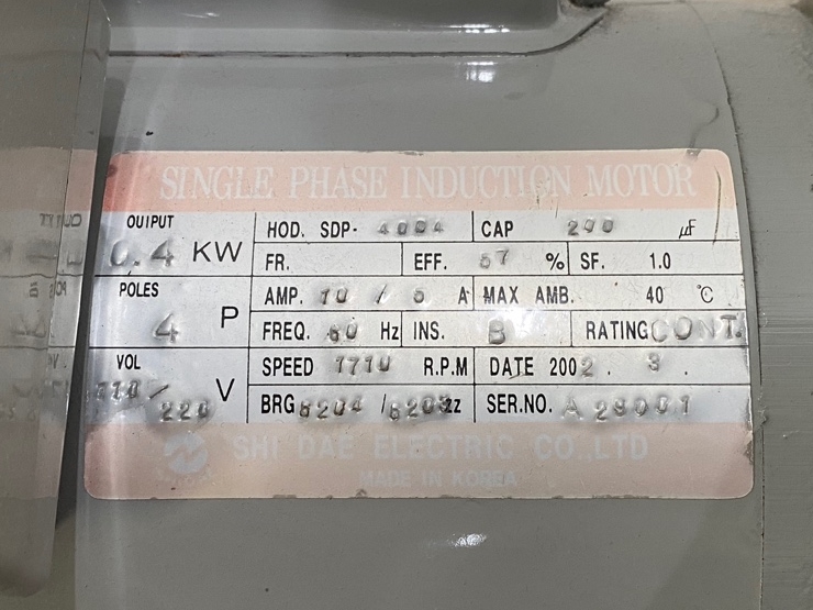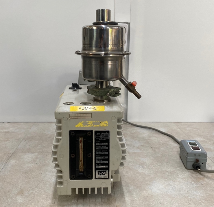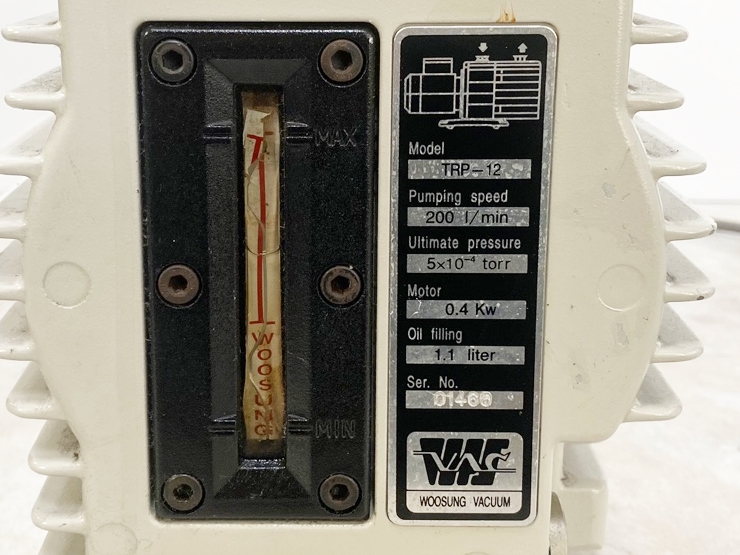 . Maker : Woosung   . Model : TRP-12   . Type : High Vacuum Rotary Vane Pump    . Ultmate vacuum : 5 X 10E -4 torr   . Pumoing speed : 200 L / Min.   . Power supply : AC220v, 400Watt(1/2Hp)