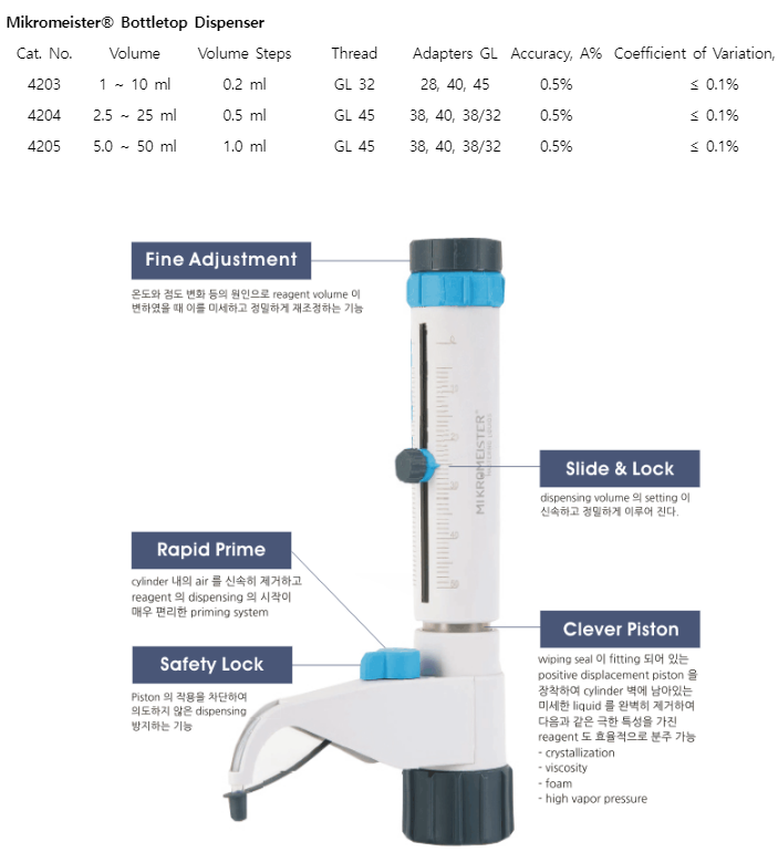 . µ¶ÀÏÀÇ Á¤¹ÐÁ¦Á¶±â¼ú¿¡ ÀÇÇØ Á¦À۵ǾîÁø MIKROMEISTER BOTTLETOP DISPENSER  . Çõ½ÅÀûÀÎ Valve system À» ÀåÂøÇÏ¿© reaentÀÇ ¼Õ½ÇÀÌ ¾ø´Ù  . dispenser °¡ ÇϳªÀÇ moudle ·Î ¼³°èµÇ¾î ¼ö¸íÀÌ ¸Å¿ì ±æ´Ù  . °»ê, °¿°±â ¹× À¯±â¿ë¸Å¿¡¼µµ »ç¿ë °¡´É