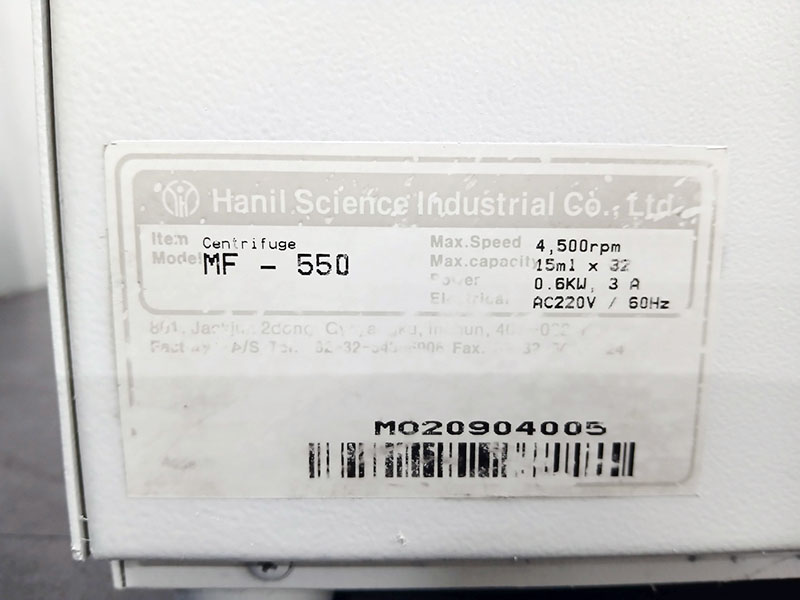 . Maker : Hanil  . Model : MF-550  . Max RPM : 4500 RPM  . Capacity : (50ml x 2) x 2EA, (15ml x 8) x 2EA