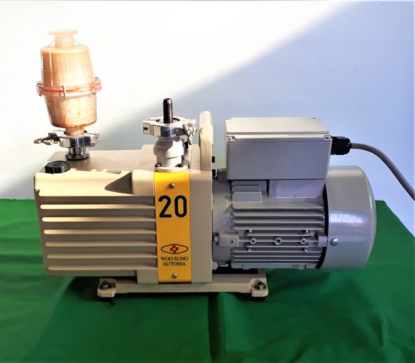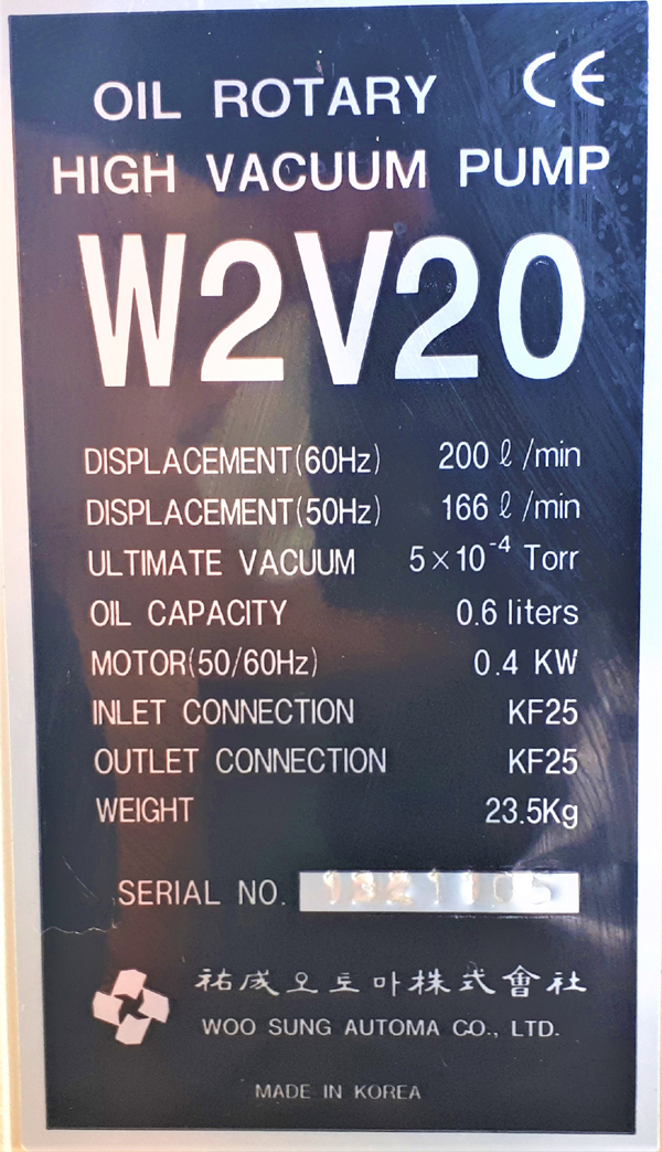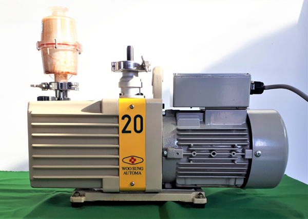 . Maker : Woosung . Model : W2V20 . Condition : Used(A+) . Type : OIL ROTARY HIGH VACUUM PUMP . Ultmate vacuum : 650mmHg Áø°ø¿Àºì¿ë . Oil Capacity :0.6Liter . Displacement : 200l/min(60Hz) , 166l/min(50Hz) . Motor : 0.4Kw . Weight : 23.5Kg