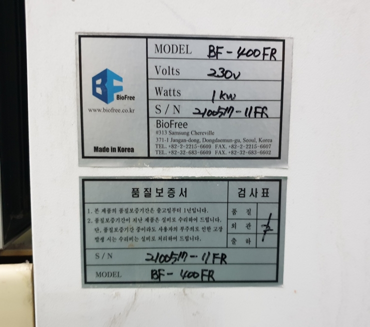 . Maker : Biofree . Model : BF-400FR . Å©±â : w 670 X d 675 X h 1,960 mm, 400 L . Temp. Range : 10¡É ~ -25¡É . 2 Glass Door . »óÅ : Áß°íǰ