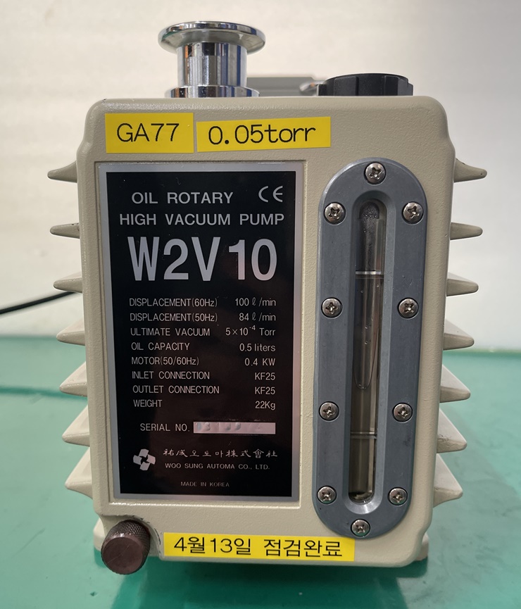 . Maker : Woosung   . Model : W2V10    . Type : High Vacuum Rotary Vane Pump    . Áø°øµµ : 0.05 Torr   . Pumoing speed : 100 L / Min   . Power supply : AC220V   . Áß°íÁ¦Ç°