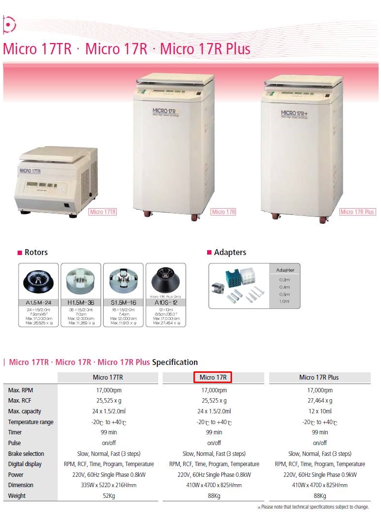 . Model : MICRO 17R . Max. Speed : 17,000rpm . Max. capacity : 1.5ml x 24 . Áß°íÁ¦Ç°
