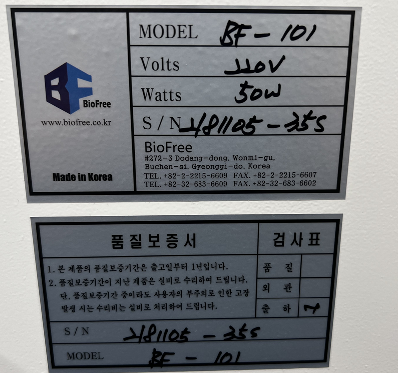 . Á¦Á¶»ç : Biofree  . Model : BF-101  . Oilless Diaphragm-Type  . Max. pressure : 6kgf/§²  . The degree of a vacuum : 650¡¾30mmHg  . Power requirement : 220V, 60Hz  . Trap : 3 Liter / 1 Liter  . Operation : Foot Touch  . Dimension : W300 x D330 x H300 mm  . »óÅ : ÃÖ»ó A±Þ / ¸®ÆÛÁ¦Ç° (Áß°íǰ Á¡°Ë ¹× ¼ö¸® ¿Ï·á))  . »çÈİü¸® : 2°³¿ù ¹«»ó ¼ö¸® / °æ°ú ½Ã À¯»ó ¼ö¸® (ºÎǰ°¡ À§ÁÖÀÇ ÃÖ¼Ò ºñ¿ë û±¸)
