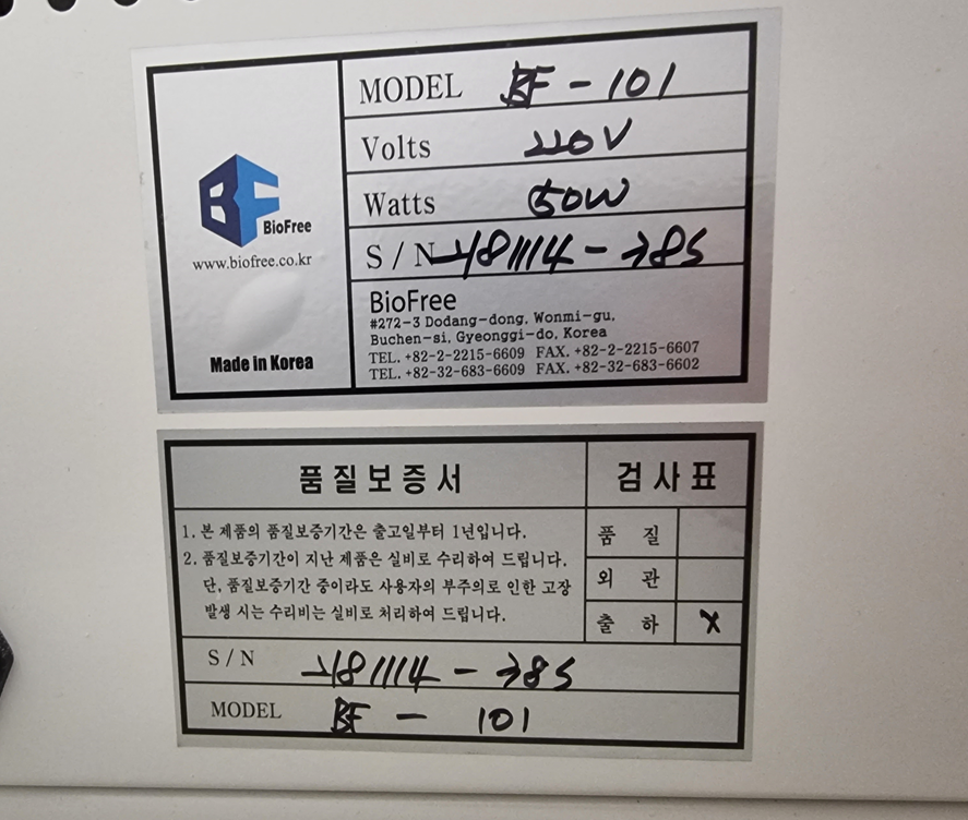 . Á¦Á¶»ç : Biofree  . Model : BF-101  . Oilless Diaphragm-Type  . Max. pressure : 6kgf/§²  . The degree of a vacuum : 650¡¾30mmHg  . Power requirement : 220V, 60Hz  . Trap : 3 Liter / 1 Liter  . Operation : Foot Touch  . Dimension : W300 x D330 x H300 mm  . »óÅ : ÃÖ»ó A±Þ / ¸®ÆÛÁ¦Ç° (Áß°íǰ Á¡°Ë ¹× ¼ö¸® ¿Ï·á)  . »çÈİü¸® : 2°³¿ù ¹«»ó ¼ö¸® / °æ°ú ½Ã À¯»ó ¼ö¸® (ºÎǰ°¡ À§ÁÖÀÇ ÃÖ¼Ò ºñ¿ë û±¸)