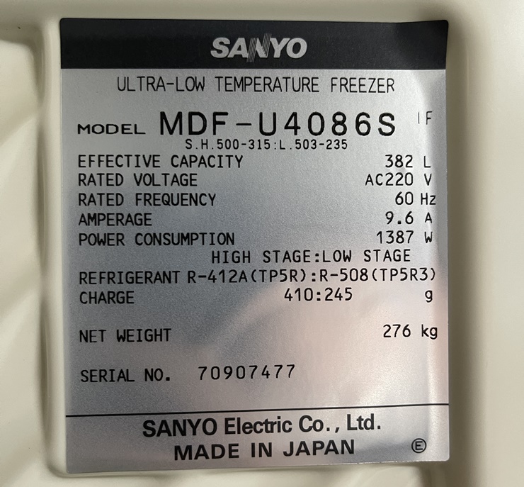 . Maker : Sanyo   . Model : MDF-U4086S  . Capa : 382 L  . Max -86¡É degree  . Å©±â : W900 X D900 X H1950 mm  . Inner doors : 2°³  . ¼±¹Ý : 3°³