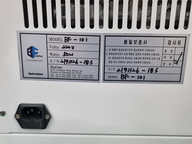 . Á¦Á¶»ç : Biofree . Model : BF-101 . Oilless Diaphragm-Type . Max. pressure : 6kgf/§² . The degree of a vacuum : 650¡¾30mmHg . Power requirement : 220V, 60Hz . Trap : 3 Liter / 1 Liter . Operation : Foot Touch . Dimension : W300 x D330 x H300 mm