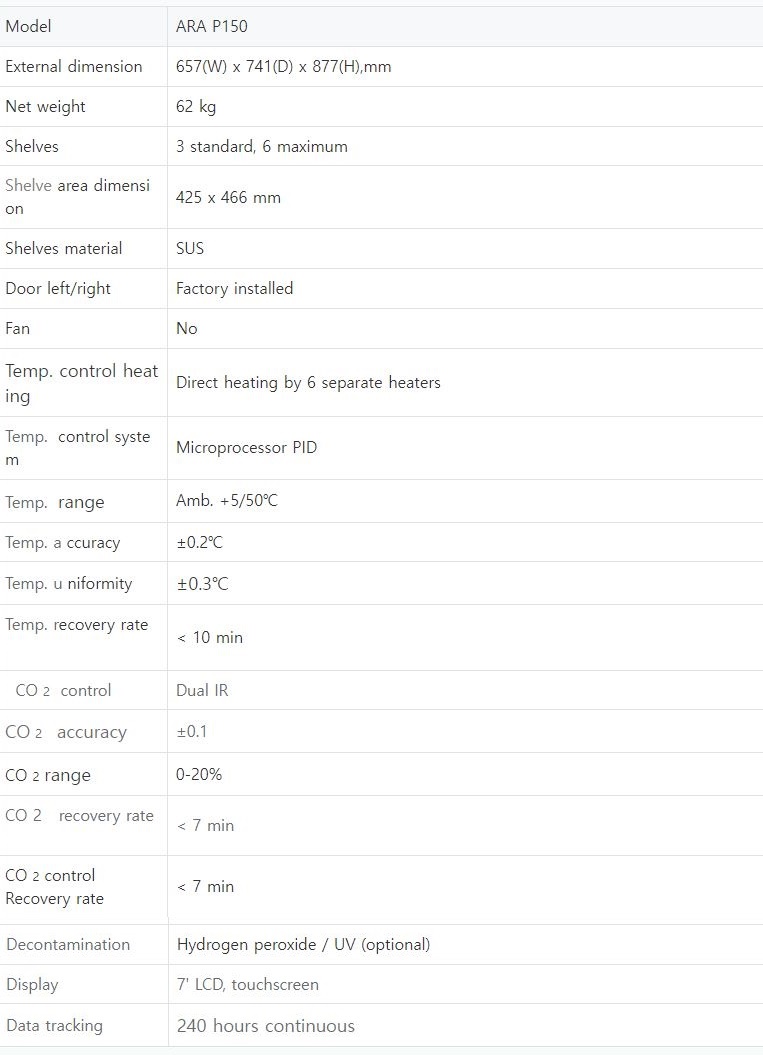 . Maker : ÇÑÀϰúÇÐ  . Model : ARA P150  . ¿ÜºÎÅ©±â : w657 x d741 x h877 mm  . ³»ºÎÅ©±â : w420 x d500 x h600 mm  . ³»ºÎ¿ë·® : 150 L  . Temperature Control Accuracy : ¡¾ 0.2¡É
