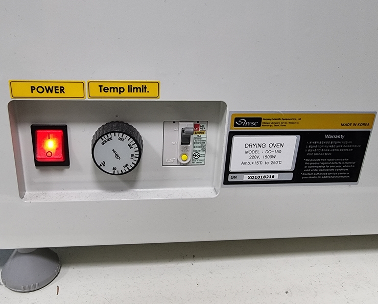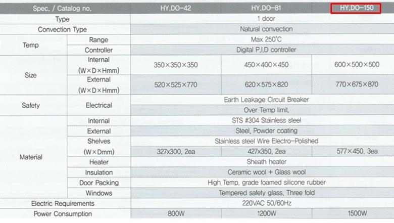 . Maker : HYSC . Model : DO-150 . ³»ºÎÅ©±â : w 600 X d 500 X h 500 mm . ¿ÜºÎÅ©±â : w 770 X d 675 X h 870 mm . Temp. range : Max 250¡É . Type : 1 door