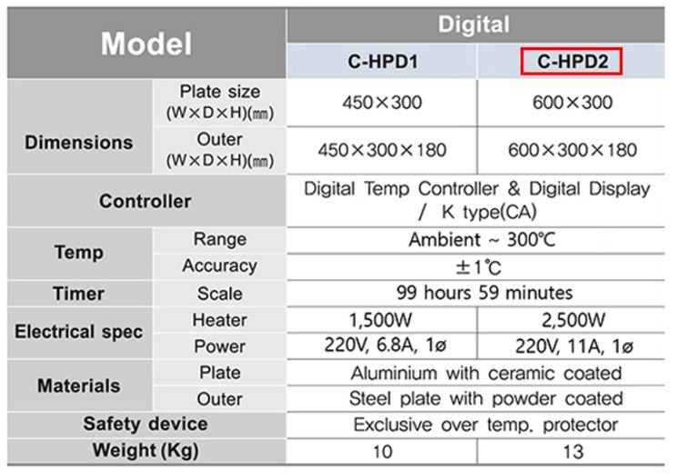 . Maker : â½Å°úÇÐ . Model : C-HPD2 . Temp. Range : Ambient ~ 300¡É . Plate Size : W600 X D300 mm . Power : 220V