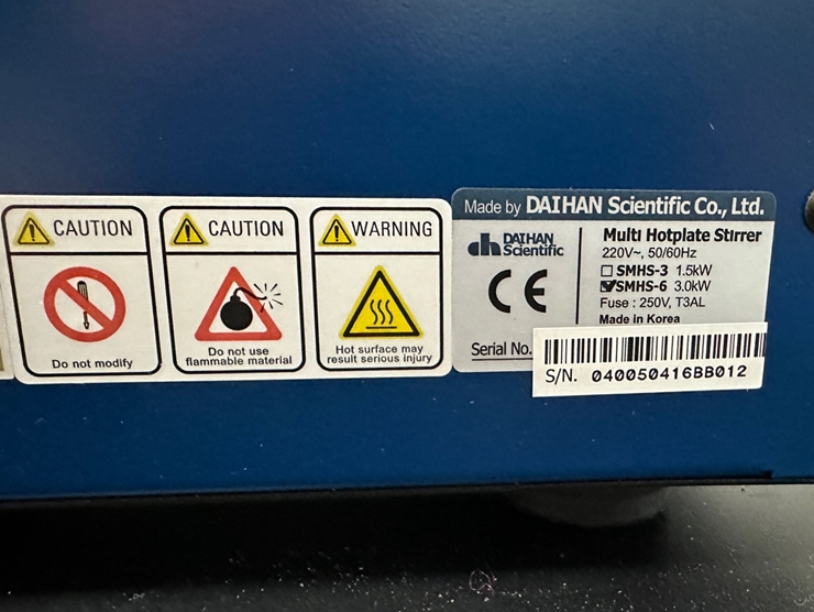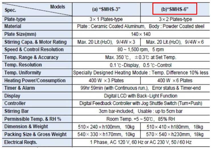 . Maker : ´ëÇѰúÇÐ  . Model : SMHS-6  . Temp. : MAX. 350¡É  . Speed : 80 ~ 1500 rpm  . Plate Size : W140 X D140 mm  . Power : 220V