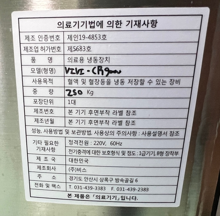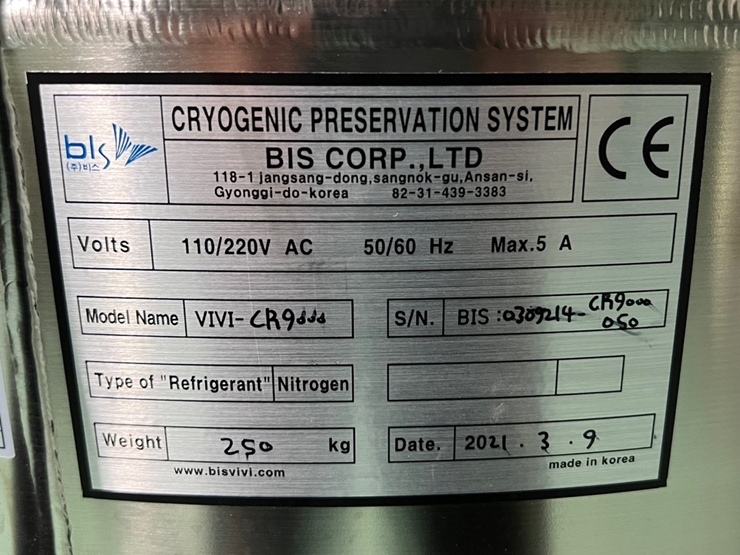 . Maker : ºñ½º (±¹»ê)  . Model : CR9000 / SUS Rack 8 ea  . 100¼¿ ·¢ ¼ö·® : 9´Ü X 8°³ X 100¼¿= 7,200 ¹ÙÀÌ¾Ë  . 25¼¿ ·¢ ¼ö·® : 9´Ü X 8°³ X 25¼¿ =1,800 ¹ÙÀÌ¾Ë  . Vapor type »óºÎ ¿Âµµ : -180¡É ~ -190¡É  . ¾×ü Áú¼Ò º¸°ü ¿ë·® : 296 ¸®ÅÍ (À§±Þ ½Ã Àå±â°£ ½Ã·á ¾ÈÀü ÀúÀå)  . Ç÷§Æû ¾Æ·¡ ¿ë·® : 64 ¸®ÅÍ / ½Ã·á¼±¹Ý º°µµ ÀåÂø (¿À¿° ³ëÃâ ÃÖ¼ÒÈ)  . KGMP ȹµæ, CE ÀÎÁõ  . ÀÇ·á±â±â ǰ¸ñ Çã°¡ ȹµæ  . ¿ë±â ³»ºÎ ½ÊÀÚÇüÀ¸·Î 4±¸¿ªÀ¸·Î ³ª´µ¾îÁ® ÀÖÀ½  (½Ã·áº° ±¸¿ª ¼³Á¤ °¡´É)  . À̺¥Æ® ÀúÀå ´É·Â 180,000 (°¢°¢ 60,000) - ¿ÂµµA,B, ½Ã½ºÅÛ, Alarm Logs  . ½Åǰ°¡ : 1500¸¸¿ø ºÎ°¡¼¼ º°µµ    . ¸®ÆÛÁ¦Ç° (Áß°íǰ Á¡°Ë ¹× ¼ö¸® ¿Ï·á)  . »çÈİü¸® : 2°³¿ù ¹«»ó ¼ö¸® / °æ°ú ½Ã À¯»ó ¼ö¸® (ºÎǰ°¡ À§ÁÖÀÇ ÃÖ¼Ò ºñ¿ë û±¸)