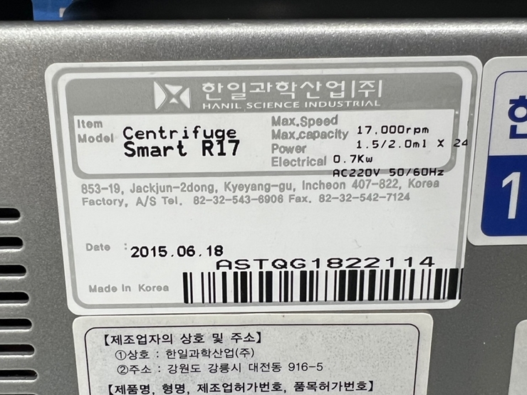 . Maker : ÇÑÀϰúÇÐ  . Model : Smart R17  . Max speed 17,000 rpm  . Temp. range : -10¡É ~ 40¡É  . 2.0 ml X 18