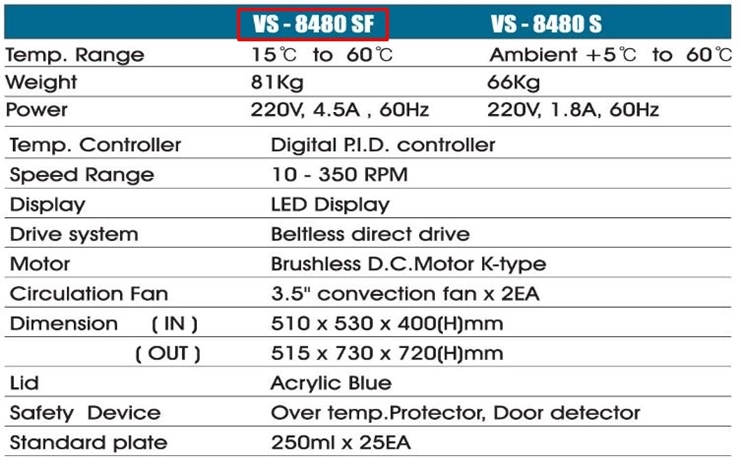 . Maker : Vision   . Model : VS-8480SF  . ³»ºÎÅ©±â : w 510 X d 530 X h 400 mm  . Speed range : 10 - 350 rpm  . Temp. range : 15¡É ~ 60¡É