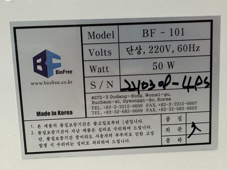 . Á¦Á¶»ç : Biofree  . Model : BF-101  . Oilless Diaphragm-Type  . Max. pressure : 6kgf/§²  . The degree of a vacuum : 650¡¾30mmHg  . Power requirement : 220V, 60Hz  . Trap : 3 Liter / 1 Liter  . Operation : Foot Touch  . Dimension : W300 x D330 x H300 mm