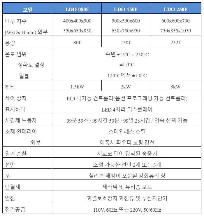 . Á¦Á¶»ç : ·¦Å×Å© . ¸ðµ¨ : LDO-150F . Temp : Amb +15¡É ~ 250¡É . ³»ºÎÅ©±â : w 500 X d 500 X h 600 mm . ¿ÜºÎÅ©±â : w 650 X d 750 X h 950 mm . ¿ë·® : 150 L