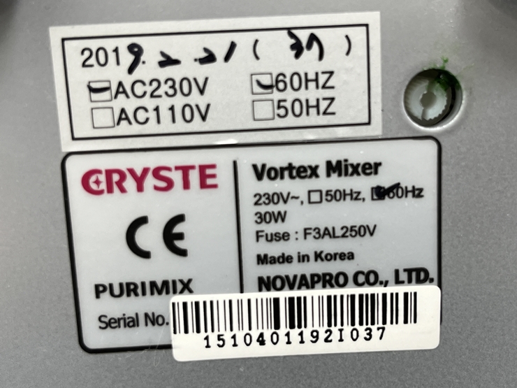 . Maker : CRYSTE . Model : PURIMIX . Speed ragne : 0~3300 rpm . Size : w100 x d70 x h100 mm . ¹«°Ô : 2.3kg . Àü¾Ð : 220V