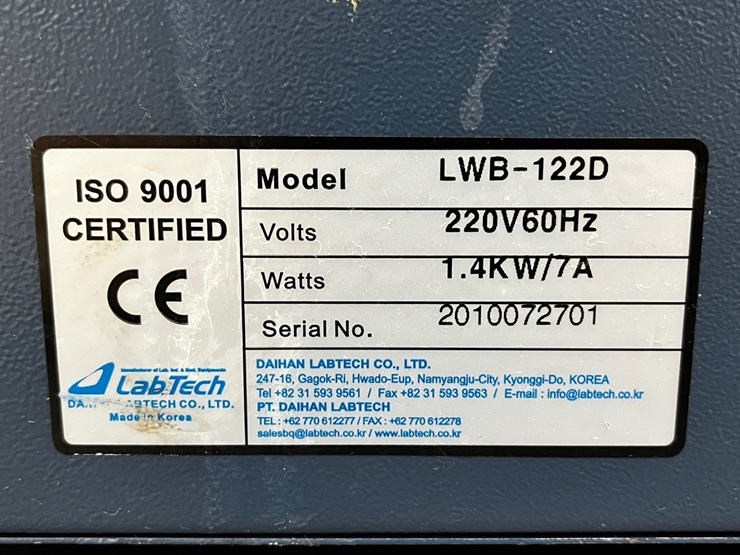 . Maker : LABTECH . Model : LWB-122D . Temp. Range : ambient 5¡É ~99¡É . Volume : 22 L . ¿ÜºÎÅ©±â : W537 X D327 X H280 mm . ³»ºÎÅ©±â : W500 X D295 X H150 mm