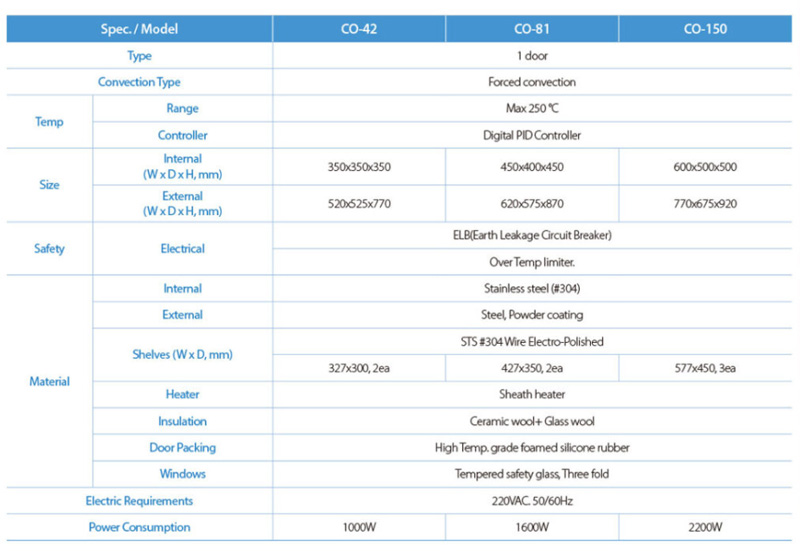 . Á¦Á¶»ç : HYSC Convection Oven ÇѾç»çÀ̾𽺷¦ . ¸ðµ¨¸í : CO-81 . Á¦Ç° À¯Çü : Convection Oven (´ë·ù½Ä °ÇÁ¶±â) . Àü¿ø : 220V, 1600W . ¿Âµµ ¹üÀ§ : Ambient +15¡É ~ 250¡É . ±¸Á¶ : Àü¸é À¯¸® °üÂûâ, ³»ºÎ ¼±¹Ý ´Ù´Ü ±¸Á¶ . ÁÖ¿ä Æ¯Â¡ : ÀÏÁ¤ÇÑ ¿Âµµ À¯Áö, ±ÕÀÏÇÑ ´ë·ù½Ä °¡¿, °ú¿ ¹æÁö ¾ÈÀüÀåÄ¡ žÀç