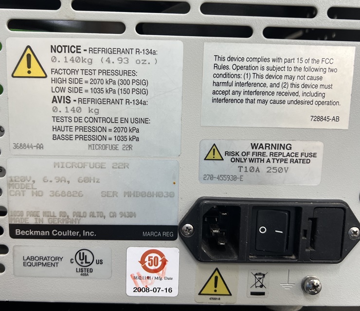 . Á¦Á¶»ç : Beckman Coulter  . Model : Microfuge 22R  . Max speed 14,000 rpm  . 1.5 ml X 24 EA  . Power : 110V